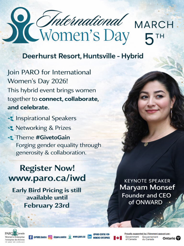 Join PARO at the beautiful Deerhurst Resort in the Muskokas, where once again we host an inspiring event live in person and streamed virtually, and welcome guests from across Ontario and beyond. Guided by the 2026 IWD theme, #GivetoGain, we will focus on increasing gender equality through generosity and collaboration with emphasis on dismantling barriers. When women thrive, we all rise!